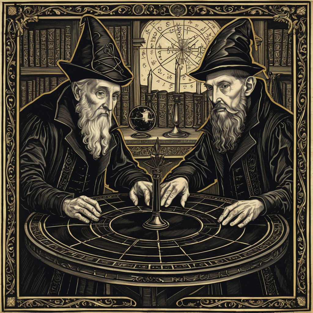 Undisputed number two to the Queen of England’s head wizard ⟨a certain Mr. John Dee⟩, a mad necromancer named Edward Kelley polishes his Shewstone. Hoping to contact the spirit world, the pair begin to engrave sacred symbols upon the black glass.