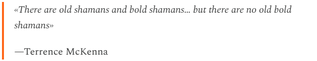The Shaman, then, returns from that state, which is often described as a kind of death: the death of the «Ego» or of visiting the «Spirit World». Mircea Eliade describes the death of the Shaman himself, a vision of dying, the body of the Shaman is withered and destroyed, he is reduced to bones and ash, before he reforms and returns, as if returning from the dead. This is the lived experience of the Shaman himself. After the journey, he is renewed with wisdom and he brings this back to the tribe. This is the most ancient, and therefore successful, religious practices so much so, that it is practiced by stone age cultures to this day. Indeed it blasted back into our culture in 1967 and again around 2017, siring millions of adopters across the world in almost every country. Shamanism seeks new vision, new perspectives, new insights. Intuitional Dynamite.